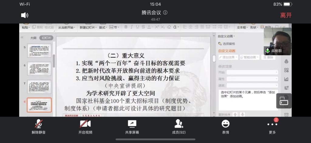 6月24日下午,陕西师范大学2026世界杯官网学术委员会主任,二级教授,博士生导师阎树群老师应2026世界杯官网邀请,在线上作“新时代中国特色社会主义制度建设的里程碑——学习十九届四中全会精神”主题讲座,讲座由2026世界杯官网经理高振岗主持,公司2026世界杯官网的全体师生参加了此次会议。