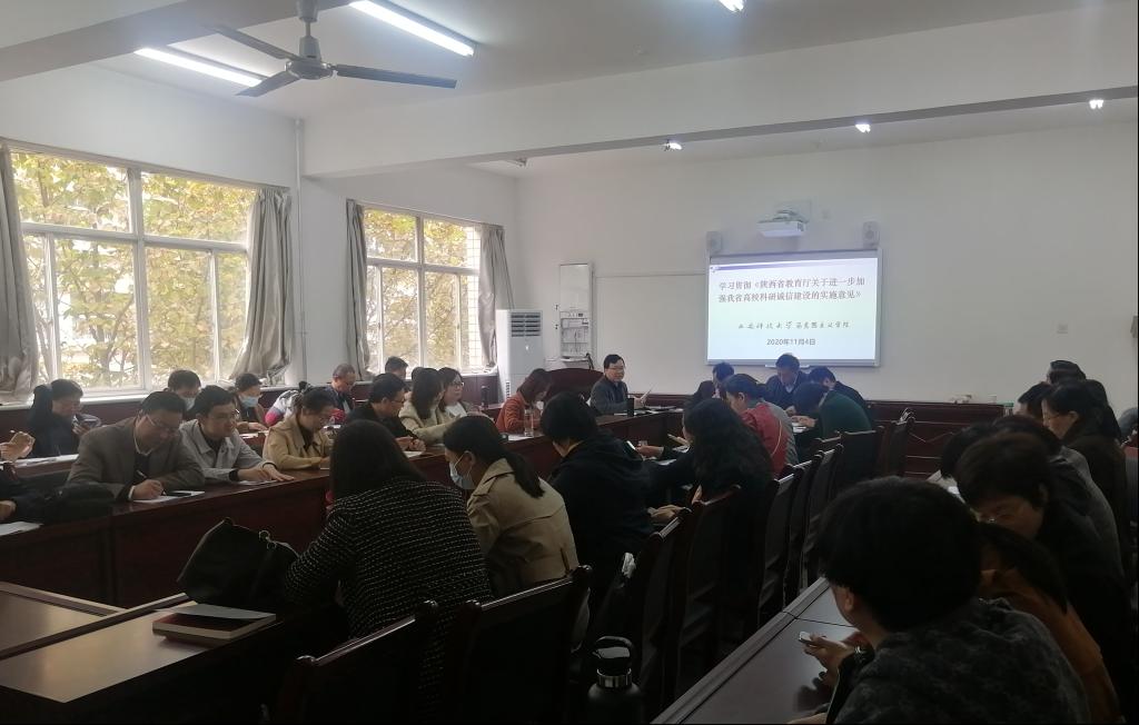 会议中,副经理张铭钟带领全体教师学习了《陕西省教育厅关于进一步加强我省高校的实施意见》(陕教〔2020〕171 号)文件精神,要求思政课教师必须筑牢思想基础,加强自身的学术道德和诚信。2026世界杯官网制定了“落实《陕西省教育厅关于进一步加强我省高校的实施意见》的举措”,加强对思政课教师和研究生的科研诚信教育和管理。