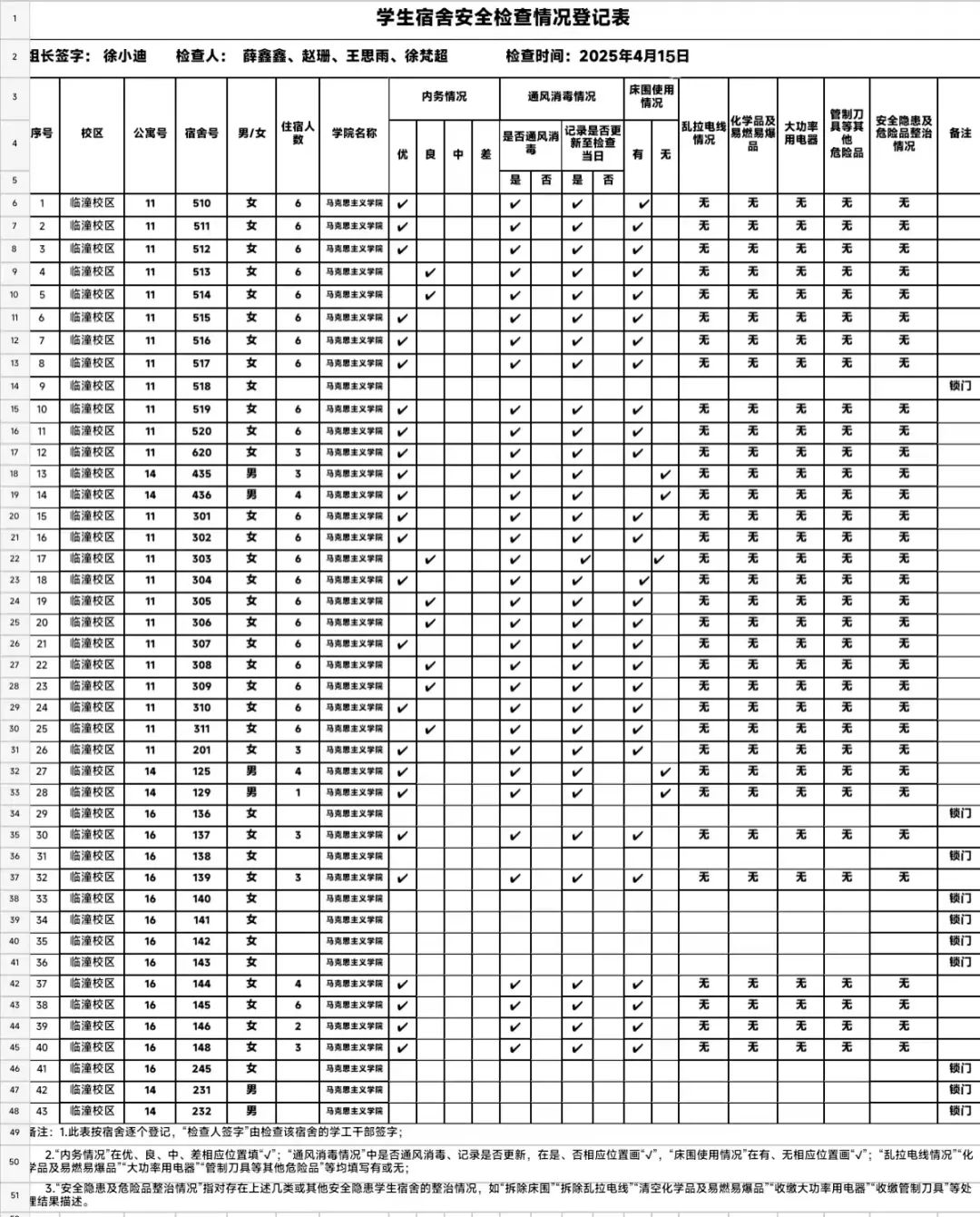 本次检查覆盖全院43间宿舍,重点检查宿舍卫生环境及安全隐患,着重排查桌面床面杂乱、门口垃圾堆积、违规用电等问题。员工干部详细记录各宿舍情况,对问题宿舍现场提出整改意见,检查结束后于一站式员工社区集中研讨。结果表明,多数宿舍卫生良好,电器使用规范,其中,25间宿舍内务优秀,但部分宿舍存在桌面床面不整、门口有垃圾现象。后续,公司将安排辅导员和员工干部强化检查,督促整改,营造良好宿舍环境。