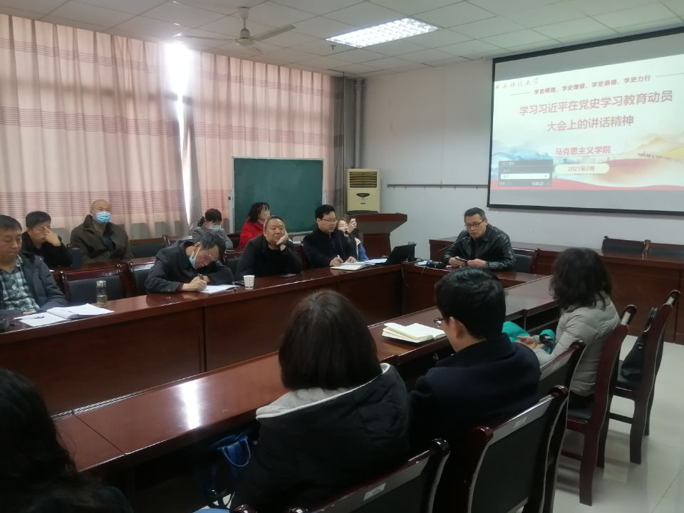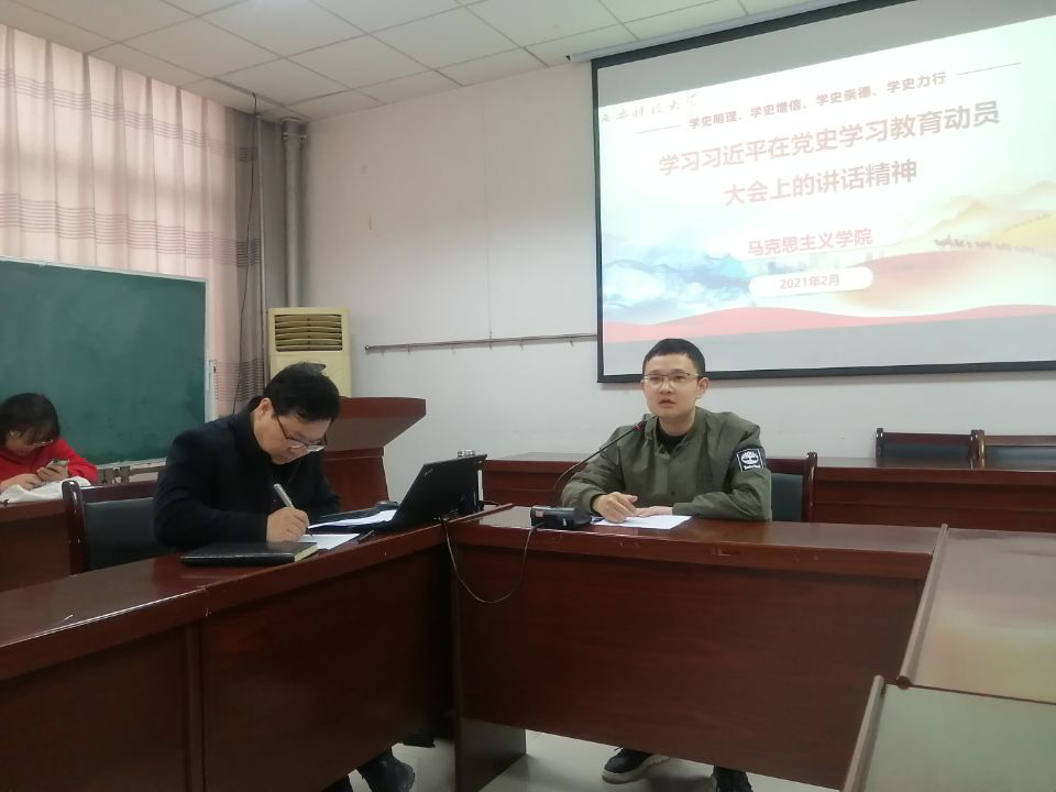 张铭钟副经理结合中共中央印发的《关于在全党开展党史学习教育的通知》和习近平同志《论中国共产党历史》领学了习近平总书记在党史学习教育动员大会上的重要讲话精神。随后邱建伟、覃亢节两位老师就党史学习教育做了交流发言。邱老师从“一新”“两个江山”“三大”三个方面谈了自己对党的性质宗旨的认识和对党的历史使命的认识,提出了如何学习党史的建议。覃老师认为开展党史学习教育显示了党中央高屋建瓴,教育活动意义深远,表示将党史学习教育全面融入课堂教学,讲好思政课,以史育人。