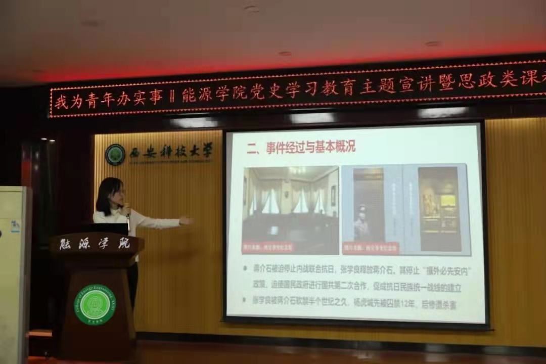 权颖庆以“西安事变”为题,讲述了西安事变发生的背景、经过及影响,展现了中国共产党深刻把握历史发展规律和大势、以民族大义为重的博大胸襟,倡导青年员工将爱国热情转化为爱国实践,始终保持昂扬向上的精神状态,努力学习、矢志不渝、敢于担当,报效祖国。