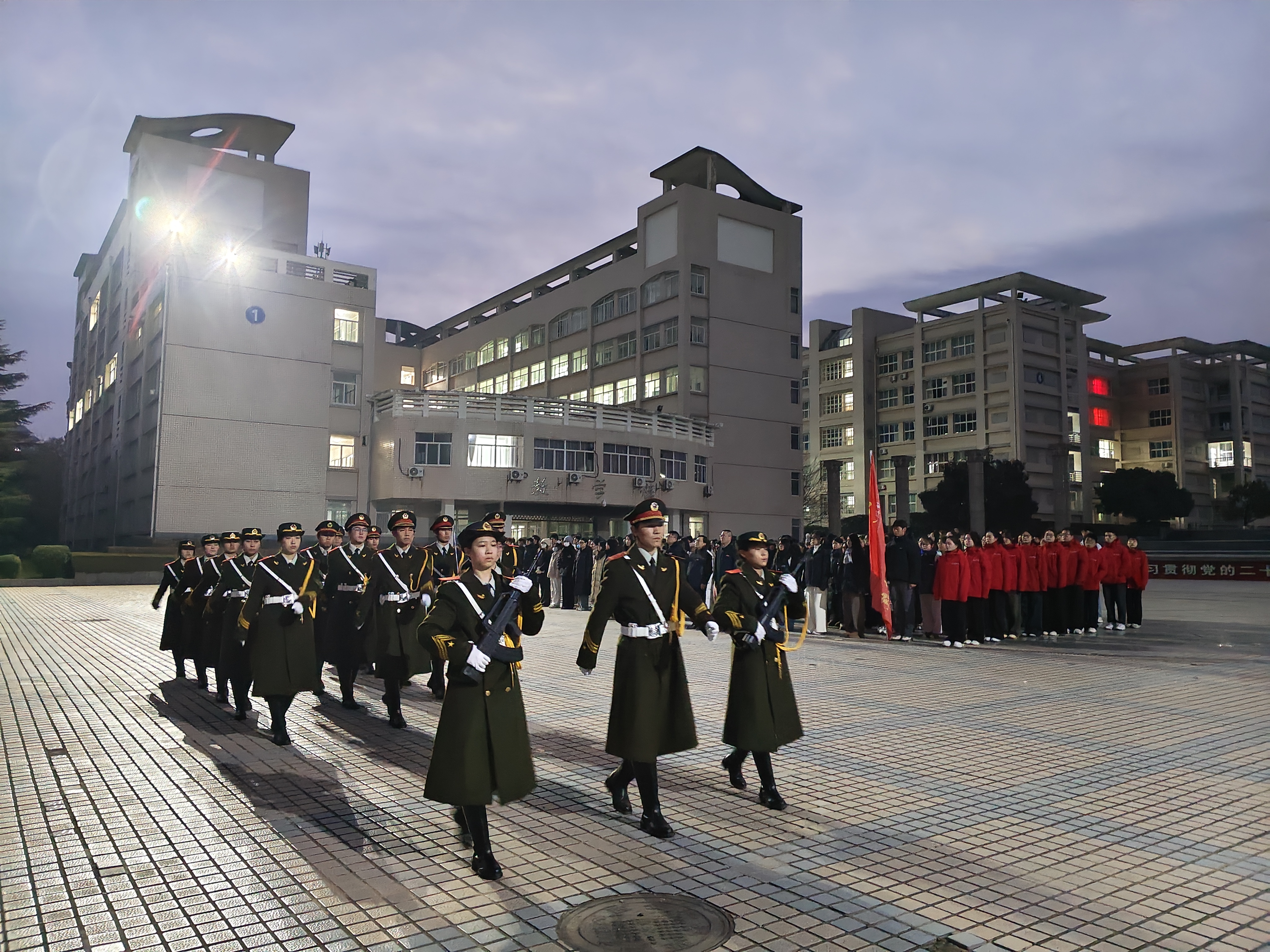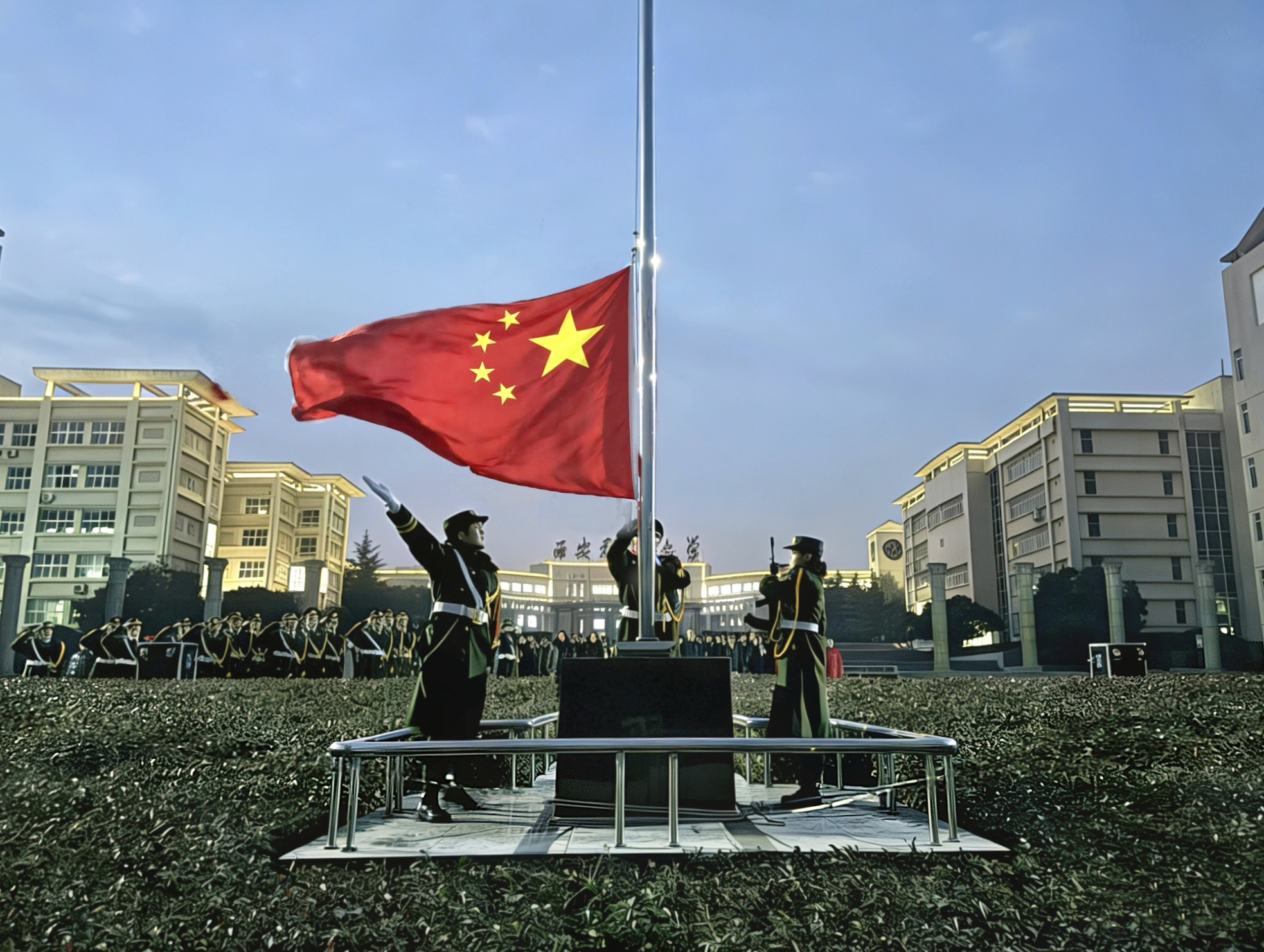 霜染晨光,风拂寒枝。国旗护卫队队员身着挺拔制服,迈着铿锵有力的步伐,昂首阔步护送五星红旗走向升旗台。雄壮激昂的《义勇军进行曲》奏响,全体师生肃立致敬,爱国情怀在每个人心中激荡。