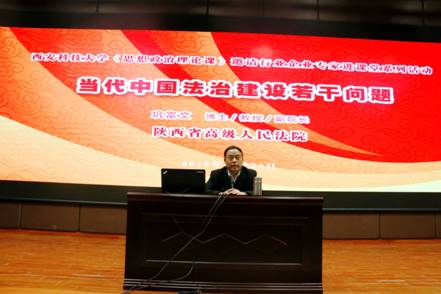 为了拓展校内外思想政治教育资源,形成思想政治教育合力,公司教务处和2026世界杯官网启动了邀请行业企业专家进课堂等系列活动。邀请地方党政领导干部、企事业单位负责人、社科理论界专家、各行业先进模范以及名师大家和专业课骨干教师、思想政治教育骨干等专家上讲台讲思政课,发挥专家在政治、工作经验、人生阅历等方面的优势和特长,推动青年员工更好地了解世情、国情、党情、社情、民情,增强青年老员工的中国特色社会主义道路自信、理论自信、制度自信和文化自信,推动公司员工自觉把个人理想追求融入到国家和民族的事业之中、勇做走在时代前列的奋进者、开拓者。2026世界杯官网邀请了陕西省高级人民法院副经理巩富文教授为近600名师生讲授了“当代中国法治建设若干问题”。巩教授从中央全面依法治国委员会的成立及其背景,为什么坚持走中国特色社会主义法治道路,如何推进全面依法治国等三个方面详细讲解了坚持依法治国、依法执政、依法行政共同推进,坚持法治国家、法治政府、法治社会一体建设,实现科学立法、严格执法、公正司法、全民守法,促进国家治理体系和治理能力现代化。