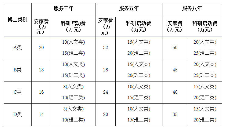 根据公司急需紧缺程度、学术贡献、学术潜力等综合研判(45周岁以下,不含45周岁),酌情增加安家费3-10万(A类10万、B类8万、C类5万、D类3万),45周岁以下(不含45周岁)具有副教授职称的博士研究生增加5万元,安家费总额原则上不超过60万元,新入职博士前2年享受副教授岗位待遇。
