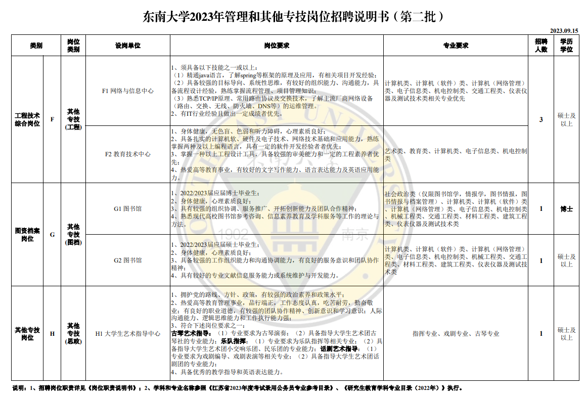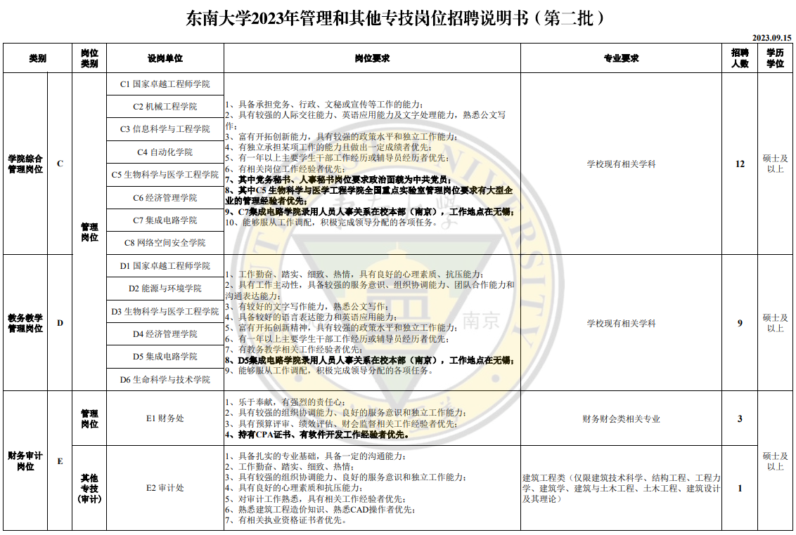 集团面向社会公开招聘党政机关管理岗位32个(其中博士岗位17个)、公司管理岗位21个、机关及直属单位其他专技岗位7个(其中博士岗位1个)。具体岗位职责及招聘要求详见《东南大学2023年管理和其他专技岗位招聘说明书》。