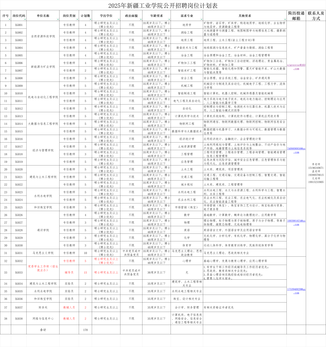 根据公司事业发展需要,此次新疆工业公司计划公开招聘事业单位工作人员170名,其中专任教师145名,辅导员15名,实验员6名,教辅人员4名,招聘博士岗位不受报名时间限制,招满即止。
