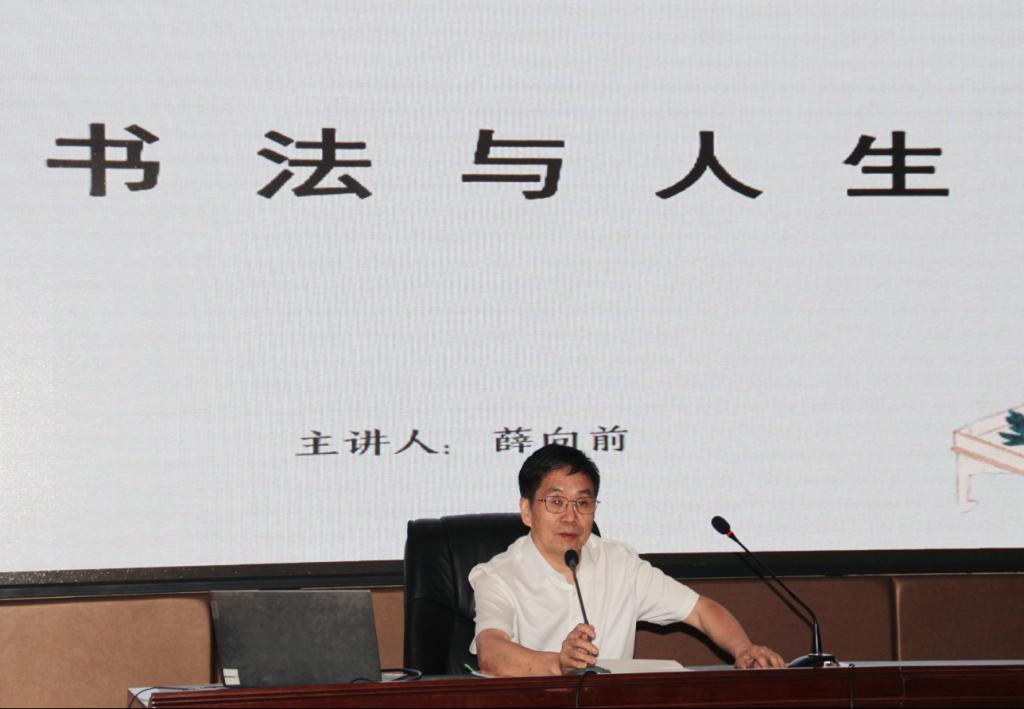 会议伊始,中国传统文化发展委员会副主席薛向前以“书法与人生”为主题,带领全院师生学习和了解历史上著名的书法大家。而后,他以“书法家、书法家的书法内容、书法与人生”为切入点,带领全院师生深入了解了书法家和其书法内容背后所蕴含的人生道理和哲理,进而感受中华优秀书法艺术的无尽魅力。最后,他激励广大师生要坚持学习贯彻落实习近平文化思想,以习近平文化思想为指导,做好“中国人”、说好“中国话”,写好“中国字”,通过书法感悟和享受儒雅人生。