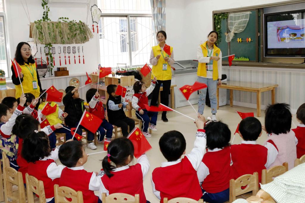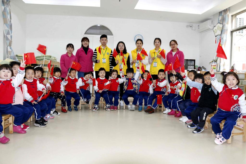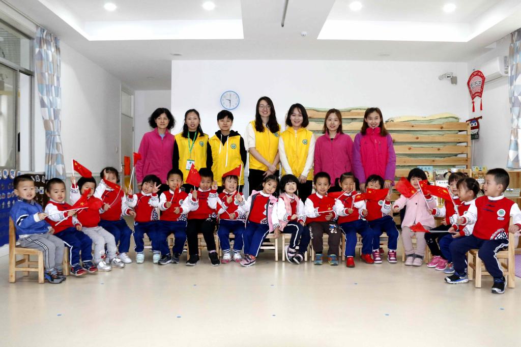 公司志愿者和小朋友一起参加升国旗仪式